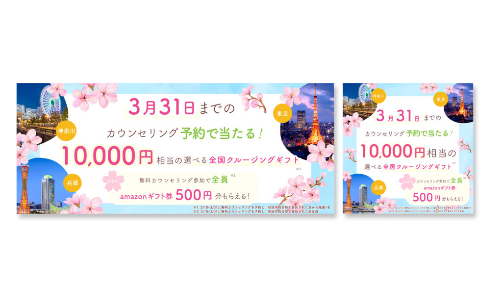 バナー作成 2025年8月3日 最終更新日時 : 2025年8月3日 pirin3737 【製作時間】3時間/1枚【使用ソフト】Photoshop・illustrator【担当業務】デザイン【意識した亊】春らしい季節感が伝わるデザインにしました。